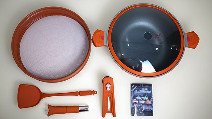 将零件都取出后,相对来说还是比较丰富的,包含了蒸篮、防粘垫、锅体、锅盖、锅铲、炒锅把手、锅盖把手、使用说明书。没错,这个锅具到手以后不是直接用了,而是需要自己动手安装的,其实也所谓的安装,只是把锅盖的把手进行固定即可。