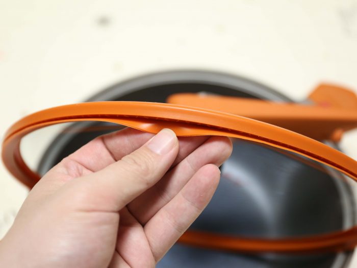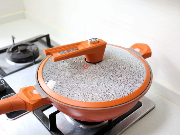 锅盖在设计上也加入了黑科技,先看外圈,采用硅胶包裹,密封效果更好!盖上锅盖能起到微压的作用(可达到17kpa微压烹饪)让食物煮的更软烂入味!而且锅盖在不用时还可以立式放置,稳定不占空间。