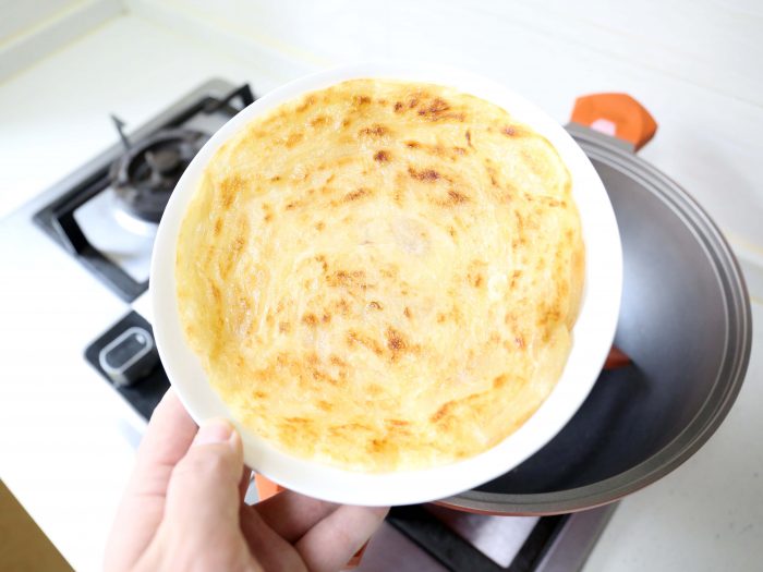 下面再测试一下这口锅受热的均匀程度,最好的方式就是烙饼。不用倒油完全不粘,中小火即可!稍许片刻后,可以看到饼子的整面,包括边角颜色基本一致,没有任何黑糊的地方,整个饼子金黄可口。五层锅底的实力不容小觑!