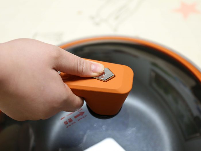 再看锅盖上这个排气阀,属于帝伯朗的专利设计,按下之后可以侧方排气,起到泄压保护的作用。