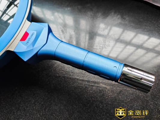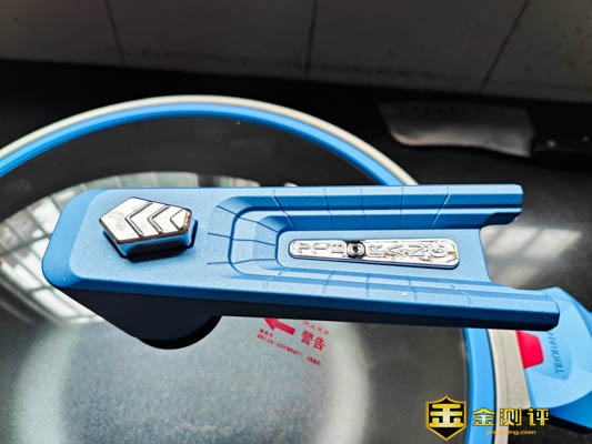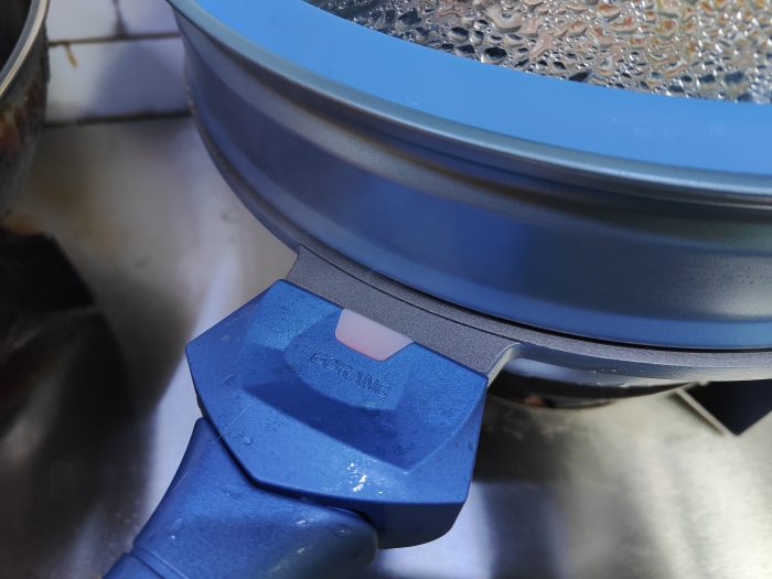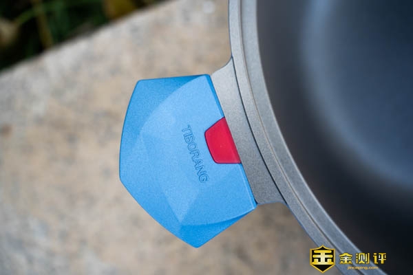 锅耳采用了隔热材料,中间红色位置为感温区域,常温状态下为红色,如果红色逐渐变白约45℃,完全变白时是140℃,锅体烫不烫手完全可以通过这里辨认出来,感觉炒菜的时候完全性还是比较有保障的。