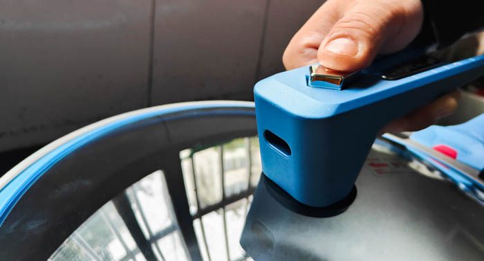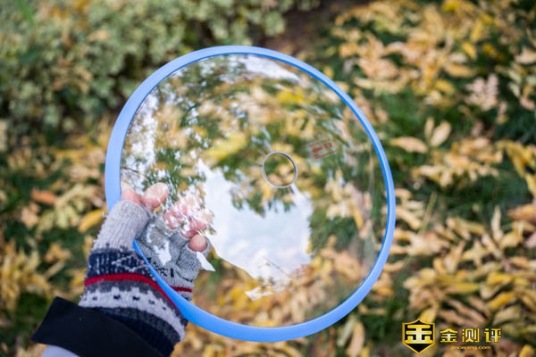 锅盖采用了钢化玻璃盖材质,蓝色的一圈是硅胶材料,这口锅是带微压功能的,盖上后可以起到密封的作用。