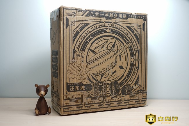 牛皮纸外包装保证了运输途中的安全,包装侧面印有不粘锅的主打卖点:安心防干烧、多功能八合一、微压锁香增鲜等特点。