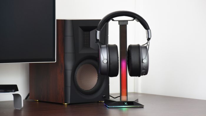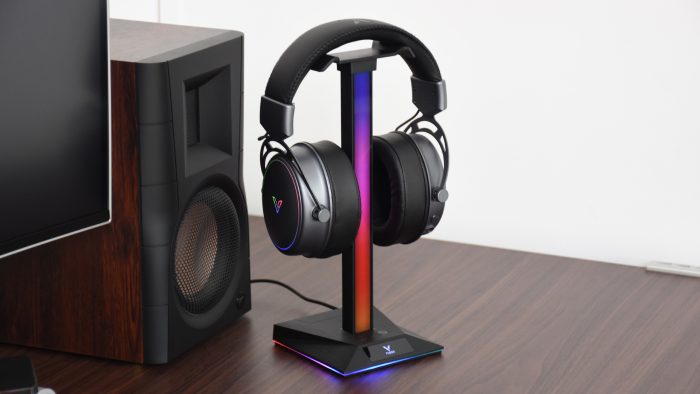 接着说说VH10 RGB耳机支架,买来搭配这款耳机使用,平常不用的时候摆在桌面上作为桌搭的一部分。与耳机的风格截然不同,这款耳机支架融入了大量的RGB灯效,甚至在正面加入了声音氛围灯,可以随着室内的声音起伏变换不同的效果,可谓既有实用性、又兼顾美观性。