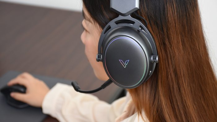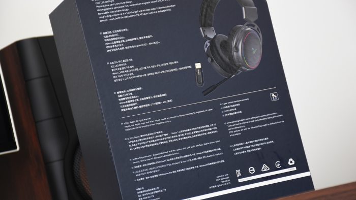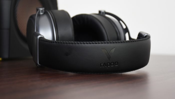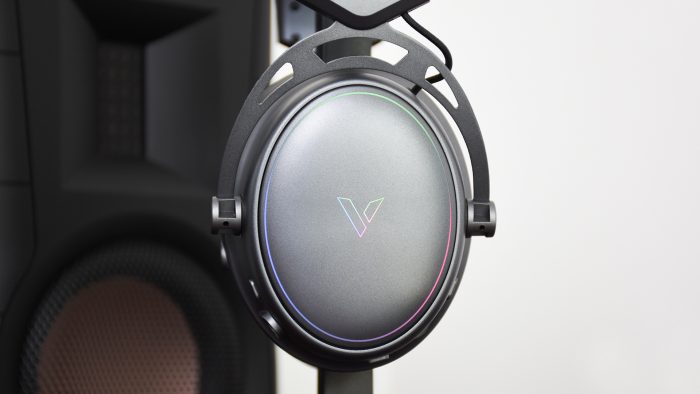 耳罩外侧盖板原本是塑料材质,但雷柏却给它做了一层类似金属质感的灰色哑光涂层,更有质感。盖板边缘和中间的雷柏V字形LOGO都内嵌有RGB灯光,不点亮时候呈白色,点亮以后灯效亮起,为这款耳机增添一些电竞色彩。