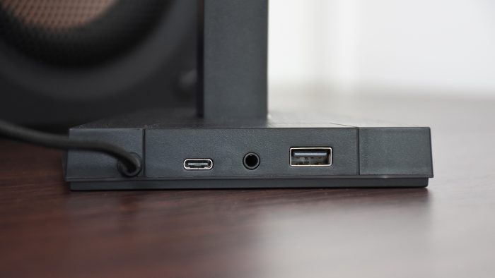 底座背部延伸出一条USB线材与电脑连接,同时起到供电和传输信号的作用。另外还预留有Type C接口、3.5毫米耳机接口和USB 2.0接口,方便日常连接一些外设。