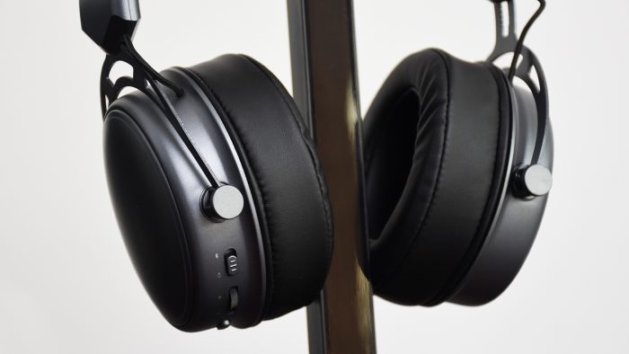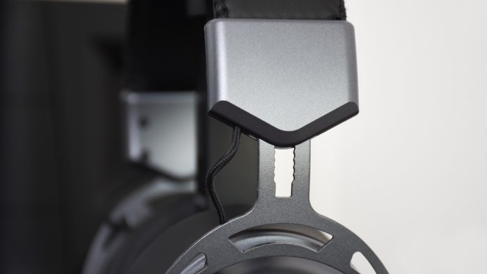 Y字型骨架采用金属材质,中间做了几处镂空的设计,削弱笨重的感觉。叉开一侧与耳罩连接,转轴的设计支持一定角度的俯仰调节,佩戴以后与头部两侧更贴合。