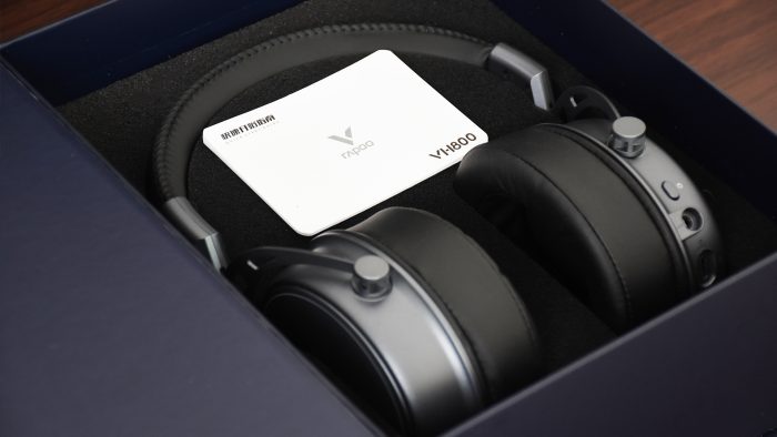 先来说说耳机,包装采用全新设计的风格,深蓝色打底,正面印有耳机的渲染图,左侧纵向标注有VH800型号字样。