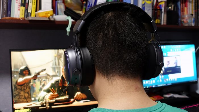 在游戏体验方面,我是插接收器连接使用,一局游戏下来,没有声音延迟或连接断掉的情况,此外还能用蓝牙连接手机平板。由于雷柏VH800采用物理双音腔结构,大幅度降低声音失真表现,游戏中可以干脆地将脚步声、枪声以及子弹打在物体上的声音区分开来,各类声音互不干扰。40mm钕磁复合膜片发声单元,带有富足的功率与瞬态爆发,使得动态范围更广,解析复杂的战争游戏音效。在实际体验环节中,尤其是需要“听声辨位”的游戏,当敌人正在移动、嗑药、开枪时,通过雷柏VH800很容易能判断出敌人的方位。