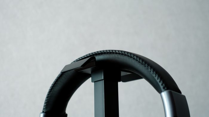 雷柏VH800的头梁部分设计较宽,皮质外层保护套配合边沿黑色色的针脚缝合线,展现出满满的游戏耳机风格。