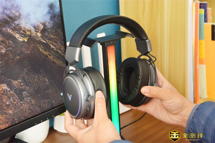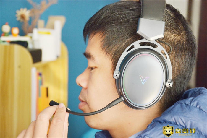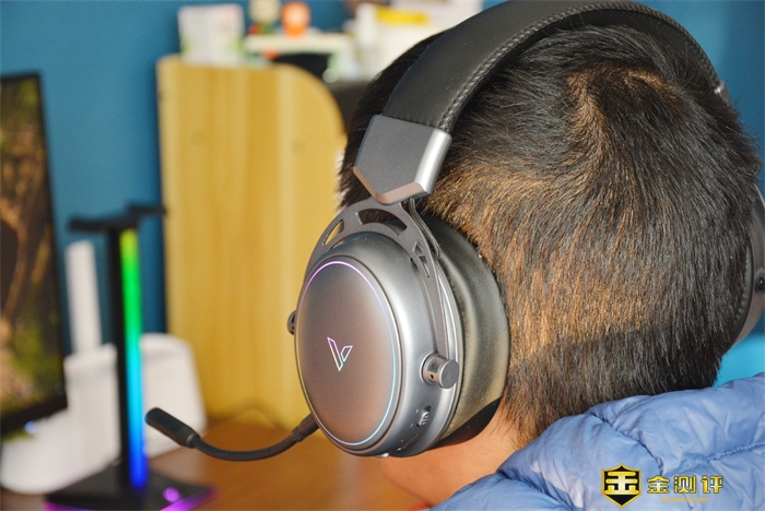 接下来佩戴雷柏VH800双模无线RGB游戏耳机进行实际体验,首先就发现它贴合耳廓、舒适度极高。不仅重量很轻,没有看起来那么沉重,而且也一点不压头顶、不夹耳朵,长时间佩戴舒适无压力,也没有线体缠绕的负担,戴着它玩游戏很轻松。