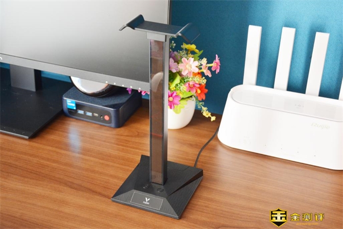将耳机支架连接电源,打开灯效,其颜值也很炫酷。尤为值得一提的是,它的灯效还能变换多种色彩,十分有个性。