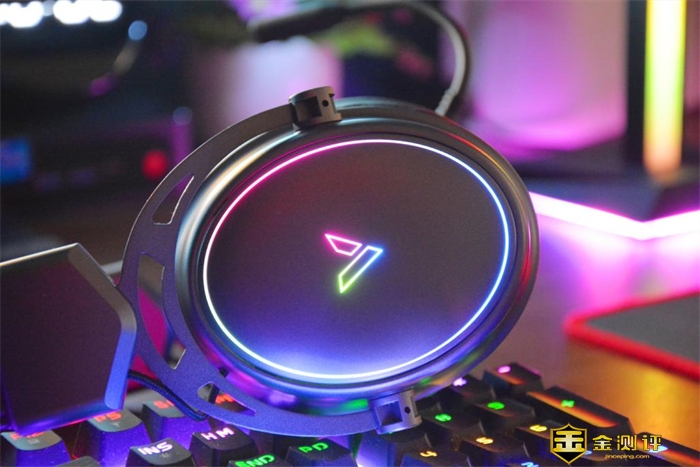 打开雷柏VH800双模无线RGB游戏耳机的背光开关,就发现它耳罩外面还有一圈彩色的环状RGB灯带,中间的品牌标识也被点亮,这马上就营造出沉浸式游戏氛围,满满的电竞风格。