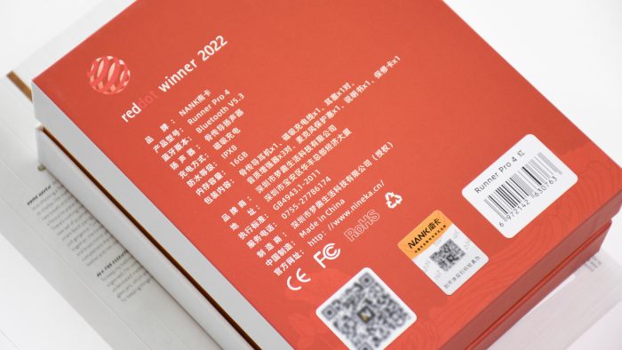 盒子背部罗列有这款耳机的技术参数、制造商信息等内容,上方还特别注明了这款耳机获得2022年红点设计大奖认证。
