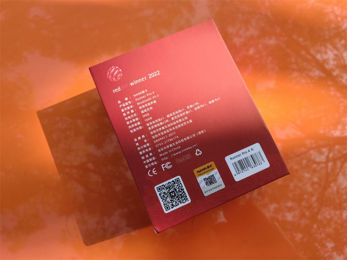 南卡Runner Pro4骨传导耳机产品包装设计整体简洁时尚,正面是产品名称和特有的外形标识,背面有这款耳机的主要的功能特点、参数和厂商信息介绍,如 这款耳机采用蓝牙V5.3方案、防水等级达到IPX8级、磁吸充电,内置16G内存等,是一款定位专业骨传导运动播放器耳机产品。