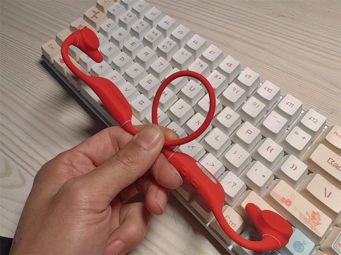 我拿到的这款为绯红色款,产品还提供暮云灰配色版本可选,南卡Runner Pro4骨传导耳机基于人体工程学设计,采用挂耳外放不入耳设计。