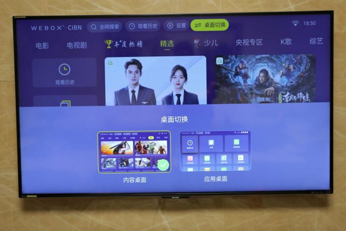 系统桌面上,WE60Pro也是别有新意的,而且还支持双桌面切换(在设置里进行桌面升级之后,还可变为三桌面,“儿童桌面”可以提供更多生动有趣的内容,真正做到面面俱到,不同家庭成员使用,都可体验私人定制的桌面)。内容布局采用的是主流的瀑布流形式,顶端内容布局一目了然,导向明确。门类齐全的影视资源,内容上涵盖了爱奇艺、bilibili、腾讯、芒果TV等几乎全网资源,想看什么基本都能搜到,这一点也是值得其它品牌电视盒子好好学习学习。