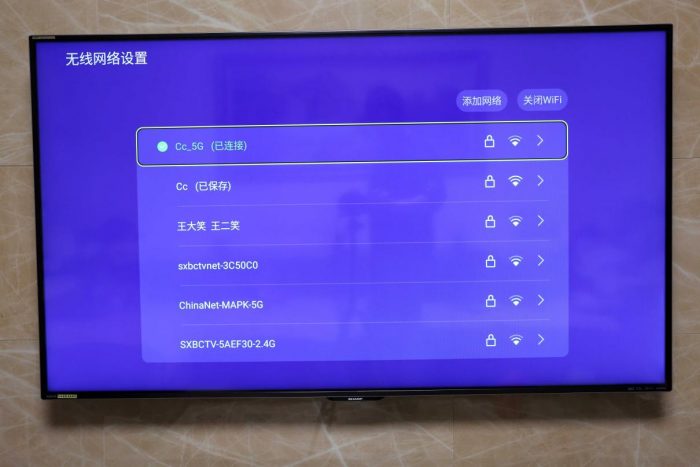 连接好HDMI线和电源就可以开机使用了,开机后我们做的第一件事自然是连接网络,可以看到这款电视盒子支持2.4G/5G双频WiFi,搭载Wifi 6,更高的无线传输速度,网速稳定更畅快。