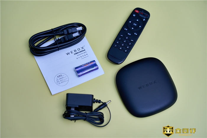 除了主机,配件还有电源、HDMI线、遥控器(含电池)和说明书。