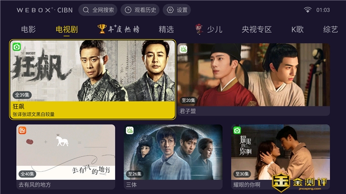 看完硬件,说回内容。虽然都是安卓底层,但是泰捷电视盒子的系统界面相当清爽高效。很重要一个原因是,泰捷聚合了各大主流视频平台的内容置于系统界面,用“电影”“电视剧”等类别标签分隔。
