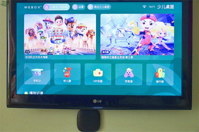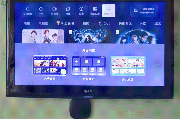 泰捷WE60 Pro的界面设置的还挺人性化的,它有三个桌面可以随意切换,“内容桌面”、“应用桌面”和“少儿桌面”,喜欢有推荐内容或是内容分类的用户可以选择“内容桌面”,而购买了某款软件VIP内容或是只用一款APP的用户则可以选择“应用桌面”,这样更简洁。不过对于作为一个家长的笔者,除了以上的选择,很多时候也会使用到“少儿桌面”,一个很有特殊作用的桌面