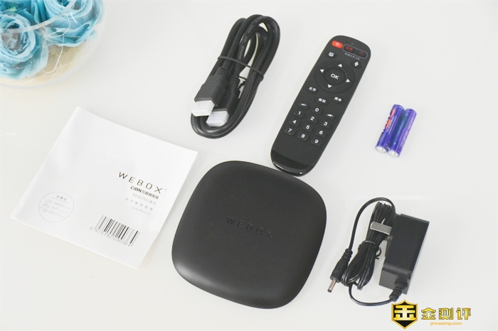 盒内该有的配件一样不少,泰捷WE60 Pro电视盒子一个,电源适配器一个,1.2米HDMI高清线一根,遥控器一个,7号电池两节,用户使用指南兼保修卡一份