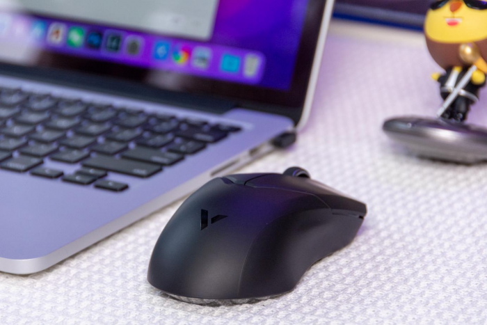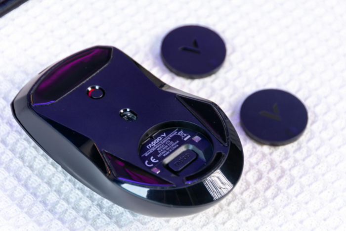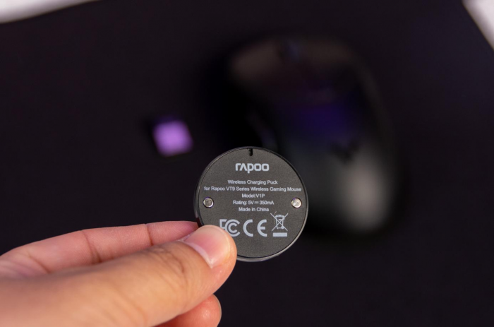 再来看下外观,雷柏VT9双模无线游戏鼠标,采用轻量化设计,重量仅有78g左右;可有线或无线使用,并且搭载了无线充电技术,底部留有一个无线充电模块拓展仓,使用雷柏V1P无线充电模块,给雷柏VT9带来无线充电功能,这是的它的精髓所在。
