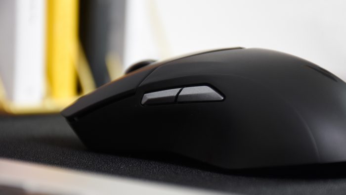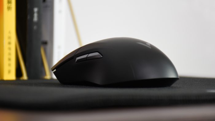 鼠标侧边没有专门设计侧裙,但对应的位置也做了向内凹的造型,便于大小拇指贴合。左侧预留有前进和后退两枚快捷键,后续可以通过驱动程序自定义它们的功能。