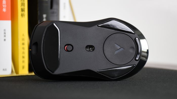鼠标底部周围是特氟龙脚垫,面积比较大,其优势在于和鼠标垫接触减少阻尼,并且比较耐磨损。拨动式开关用于开启或关闭电源,中间的凹槽内嵌有原相3399光学追踪器。