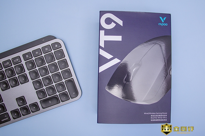雷柏VT9双模无线游戏鼠标外包装使用深蓝色的包装风格,颜色很有质感,正面印有产品展示图,第一时间给用户美好的印象,同时标注了产品型号和特点等信息,可以帮助进一步了解产品性能。