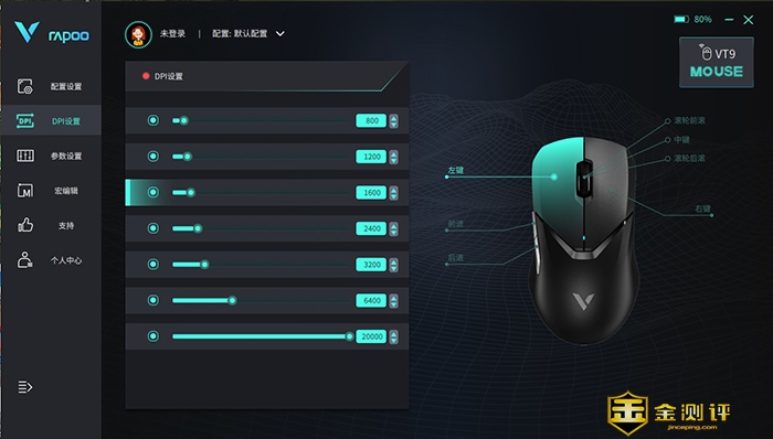 在来看下雷柏VT9双模无线电竞游戏鼠标的驱动,界面简约直观,所有设置项目的一级目录都在驱动左侧列出。其中DPI设置内可进行7档自定义设置,可以配合VT9鼠标侧键,即可实现快速轮播切换。