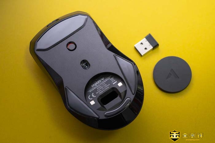 在鼠标的底部,可以看到有一个磁吸式的小仓门,轻压可以拿起这个仓门,里面有一个USB适配器的收纳槽。为了防止USB收纳器意外丢失,平时不用的时候可以把它收藏在这里面,要用的时候拿出来就好。同时,我们还可以看到这里面有两个触点,这是可以另外单独再购买雷柏V1P无线鼠标充电模块,从而可以实现无线充电的功能,让充电更加的方便。