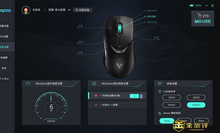 这款鼠标具有7键可编程的特性,滚轮部分的前滚、后滚、中键可以分别设置,值得一提的是,我们也可以使用其他玩家分享的配置文件,不需要从零开始手动设置。雷柏VT9上面没有专门的DPI键,但是驱动里面可以预设7档DPI,方便我们设置调用。