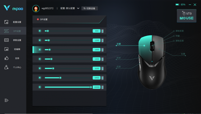 VT9在驱动程序中可以自定义7档DPI,前文提到过的7键自定义除了可看到的5颗按键外,还有滚轮前后也可以分别进行配置。
