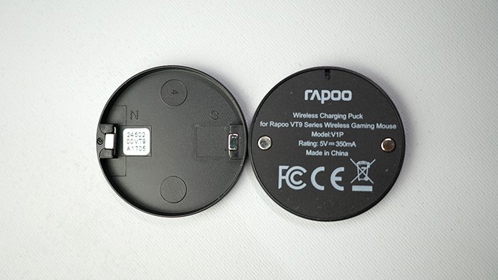 题目中提到的无线,不仅仅是指VT9支持2.4Ghz无线连接,还能够支持无线充电。起初我以为VT9底部的圆形模块是拿来改变配重的,事实证明我还年轻,这个模块就是可以实现无线充电的部分。