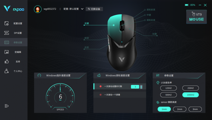 还可以通过驱动程序调整VT9的windows指针速度,滚轮速度,USB报告率,sensor静默高度。