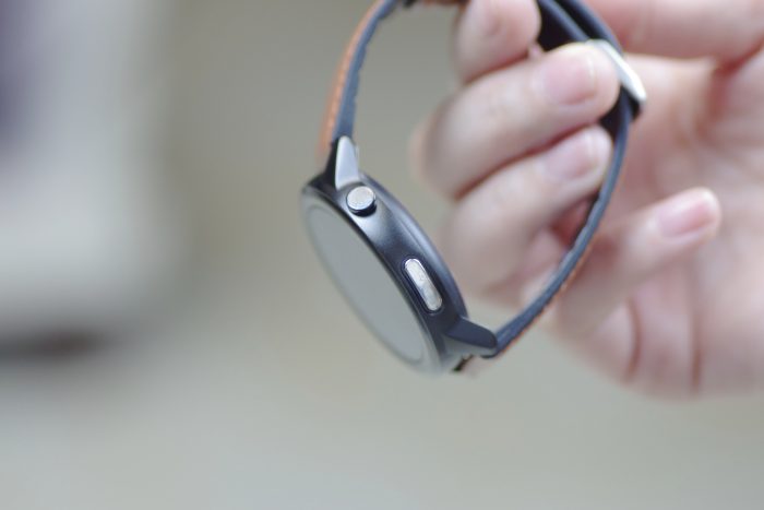 在手表的右侧设有一枚实体按键,长按是开关机操作,短按则是返回主屏界面操作。另外,在按键下方有一枚带有心电标志的金属条,在测心电的时候需要用手指按住该电极才可以实现心电监测的哦。