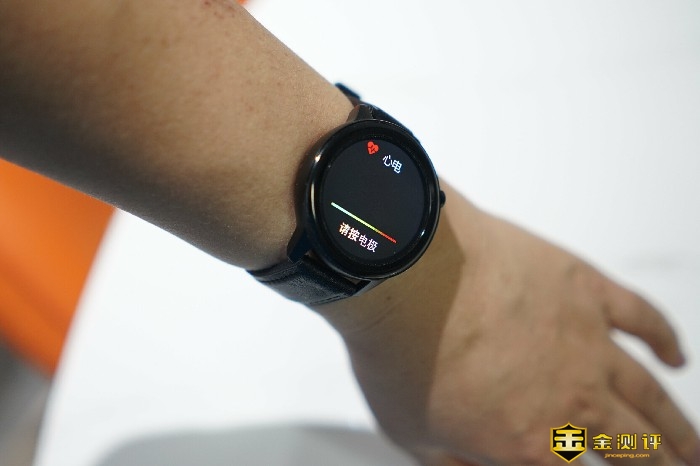 手表的侧按键设置在表盘右侧,长按即可开机,短按确定/返回上一级菜单,待机状态下短按任意键可以点亮解锁屏幕。还有一枚心电测量电极,把手指按压此处就可以测量心电图了。