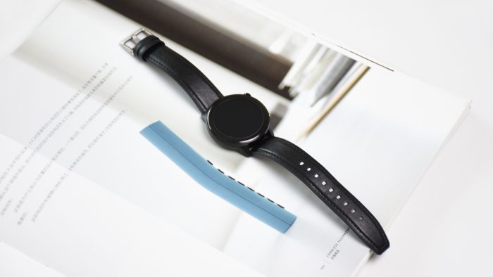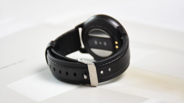 标配的腕带是皮革材质,在智能手表中的确很少见。但仔细观察不难发现,它的腕带应该是双层设计,外面一层是黑色皮革,纹理很细腻,质感不错;里面一层还是传统的硅胶材质,与手臂贴合舒适度会更好,同时也能让腕带比较柔软。