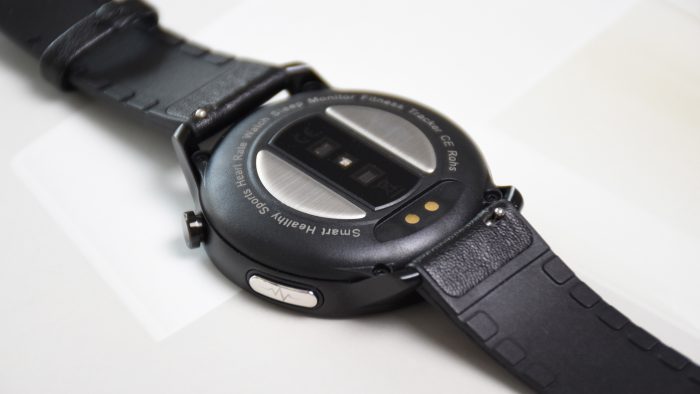 表盘背部左右两块大的金属片用于感知温度,测试体温;中间是用户监测身体数据的传感器。下方预留有两枚金属充电触点,并且适配充电线插头做了凹陷处理。