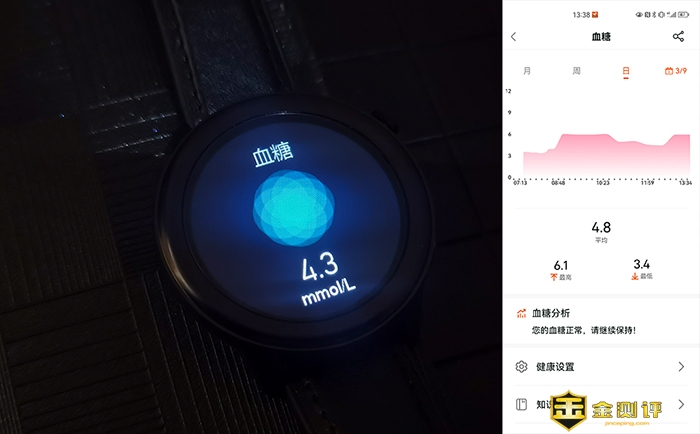 早晨空腹情况下,基本保持在4.3左右血糖,此款手表与体检报告的数值基本一致。同时当超过正常血糖范围后也会做出提示,及时控糖。