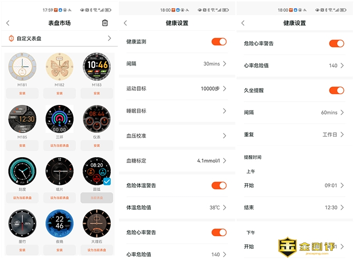 APP中可以自定义表盘,并能够自己DIY一些个性表盘,其中还有健康设定,对于身体关注的指标设置报警阈值,提醒注意健康运动或就医,并在内部设有久坐提醒等使用提示功能。