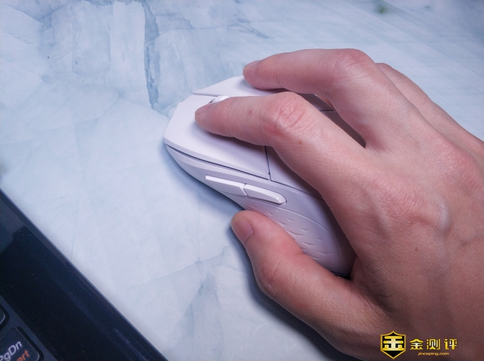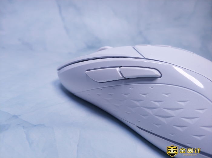 两侧采用了V型纹理设计,防滑的同时也便于透气排汗,能增加持握的稳定性,长时间游戏也不会影响使用。左侧有前进键和后退键,在游戏鼠标中比较常见,可通过驱动软件进行自定义设置。