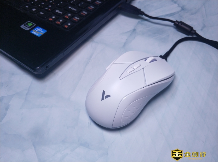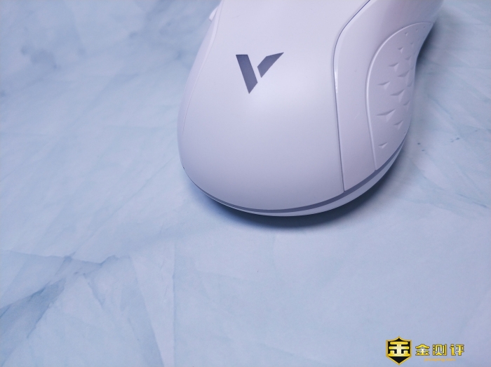 整体尺寸为123*68*41mm,左右手对称,适合中小手型人群使用,外形采用了人体工程学设计,能增加握感舒适度,长时间玩游戏也不费力,正面有雷柏的logo,能增加辨识度。