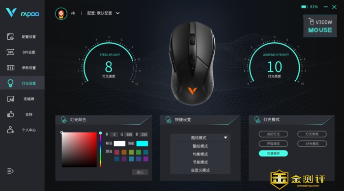 在滚轮区、LOGO区和尾部配置有RGB灯效,灯光炫酷好看不刺眼,提供有炫酷模式、平衡模式以及节能模式可选,还有10档灯光速度和亮度可调。同时采用了新升级的低功耗无线技术,续航时间相当持久,节能模式下续航可达160小时左右。