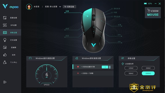 相比普通的鼠标,雷柏V300W的自定义范围更大,使用雷柏的官方RapooGameDev软件,可以轻松进行各种定制化设置,带来更顺手的操作体验。这款鼠标的DPI可达16000,USB回报率有1000Hz,调节范围很大,此外它上面的9个按键操作都可以随意设置,满足各种游戏需要。