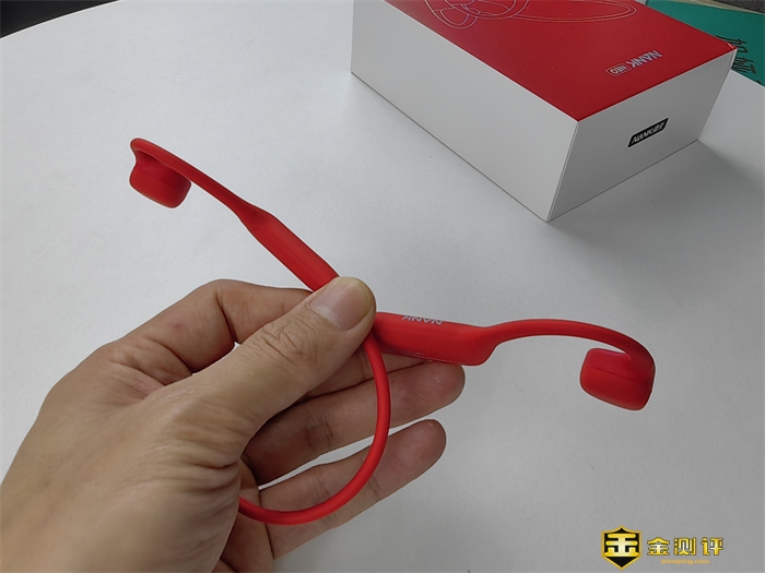 我拿到的这款为朱砂红款,产品还提供瓦松绿、静谧灰共三个配色版本可选,南卡Neo骨传导运动耳机基于人体工程学设计,挂耳外放不入耳,耳机全机身都采用了新材料医用级液态软硅胶包裹,佩戴体验轻盈而无感,戴起来很舒服而且十分稳定,并且不会夹头,能很好地贴合耳廓。