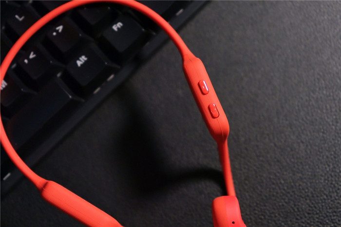 在耳机右侧分布有三颗实体按键,分别是音腔位置的多功能键(可以实现播放/暂停、接听/挂断等操作)以及右桥侧边的电源键和音量调节键(长按可切歌),微凸的设计带来了不错的手感,阻尼感也是恰到好处。
