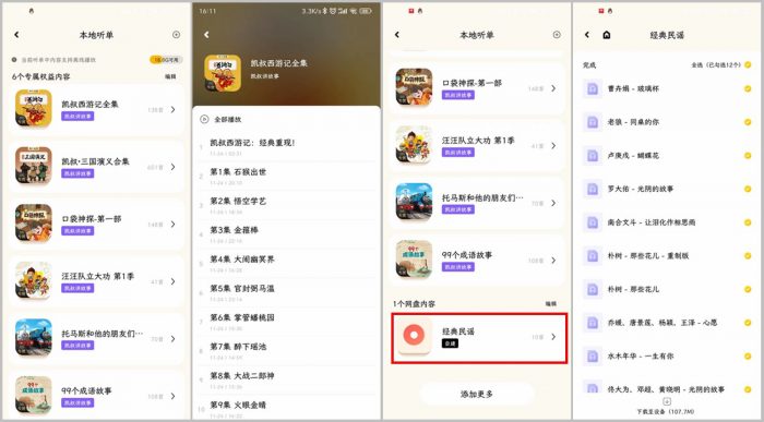 系统对于其中的音频进行了详细分类,分为故事、儿歌、英语、国学共4大类,直接通过听单切换旋钮即可循环切换,用户可以还能根据需要对听单中的内容进行移动、删除、添加等操作。