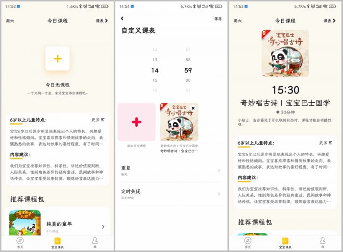 在手机APP端还加入了“宝宝课表”功能,可以方便家长根据需要给孩子进行精准排课,不仅能设置学习时间、时长、定时功能,还能一键添加多种主题课程包,培养孩子规律学习的好习惯。